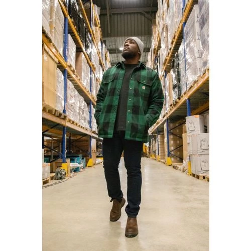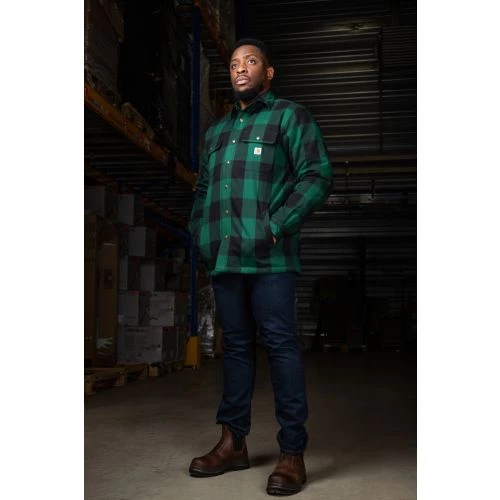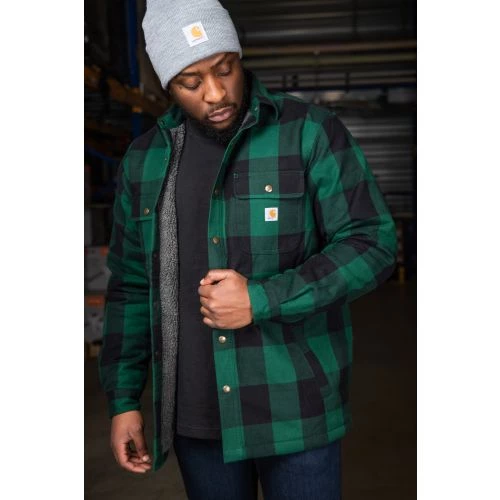 Cette chemise à carreaux de Carhartt est en flanelle lourde. Dotée d’une épaisse une doublure en piqué lisse sur les manches et une doublure en polaire sherpa sur tout le corps. Elle est assez chaude pour être portée comme une veste lors des jours froids de l′automne.