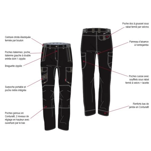 - 2 poches genoux en Cordura, 2 niveaux de réglage en hauteur, ouverture facile par le bas