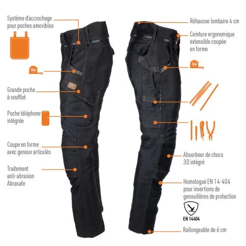 Ce pantalon de travail multipoches Bosseur HARPOON ALTI se distingue par sa composition en Moleskine 400 g/m². C’est un tissu coton / polyester épais avec une armure lisse type satin résistant à l’abrasion, à la déchirure et aux projections d’éclats de meulage et de soudure. Il est particulièrement adapté aux métiers de charpentiers, zingueurs et étancheurs. Sa coupe articulée, sa ceinture extensible coupée en forme et sa réhausse lombaire en font un pantalon étonnament confortable. Ses nombreuses poches ont été étudiées pour que tout tombe naturellement sous la main.